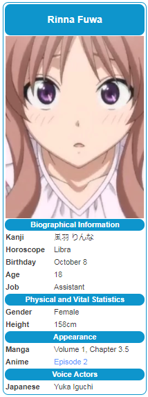 風羽りんな-1514 マンガ家さんとアシスタントさんと 第4話 「sとm」「マスコットキャラ」「ブラニャー登場」「セブンティーンみはり」 アニメ 愛徒勇気松岡禎丞/足須沙穂都早見沙織/音砂みはり能登有沙/黒井せな釘宮理恵/風羽りんな井 風羽りんな よみがな ふわ りんな 生年月日 10月8日 年齢(作品時) 18歳 身長 158cm 性別 女 所属 女子大生 性格 温厚温和やや天然ボケな性格 特徴 愛徒の熱狂的なファンでありアシスタント。